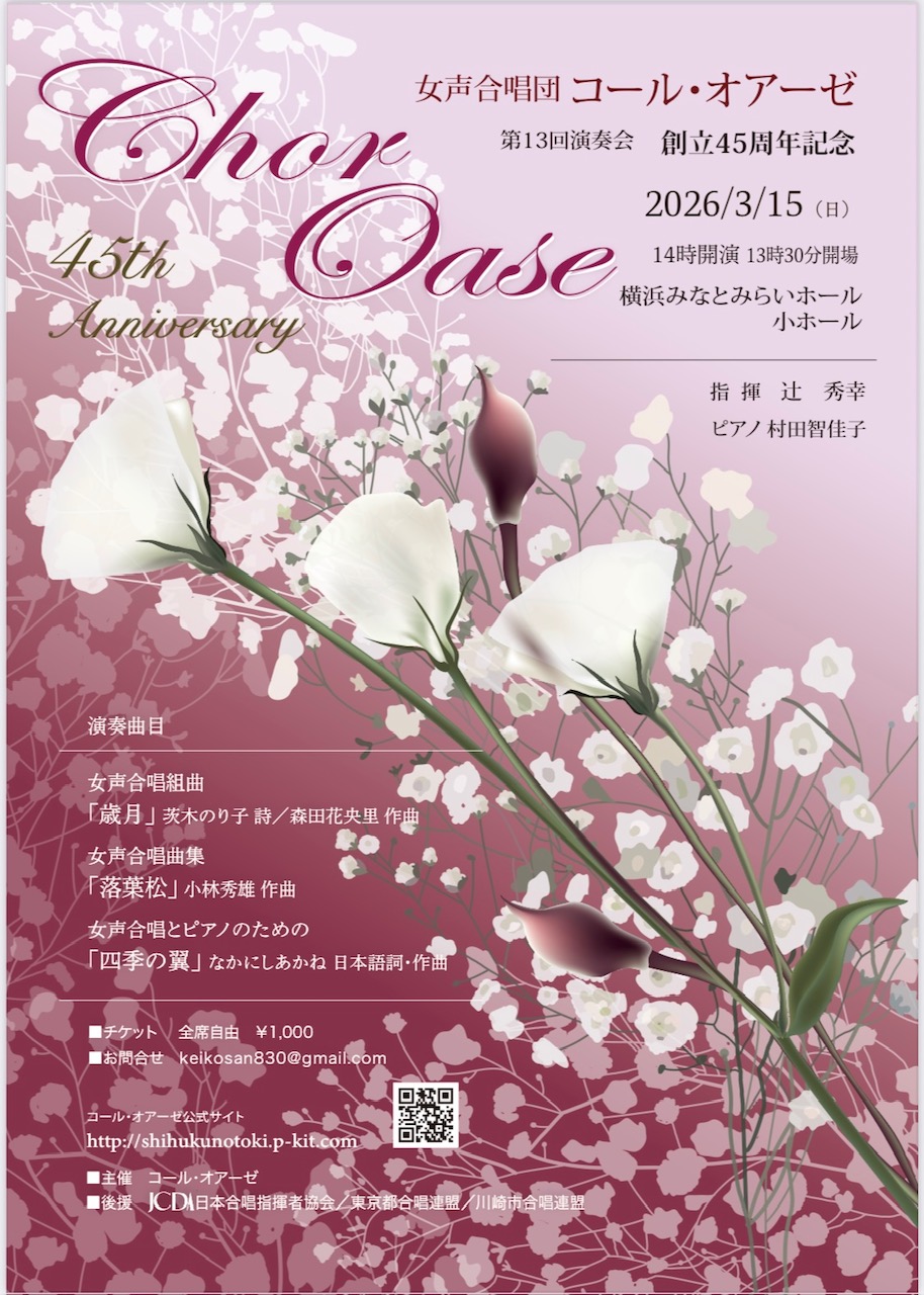 私たち、コール・オアーゼは、辻秀幸先生ご指導の女声合唱団です。メンバーは、少人数18名、温かい合唱団です。